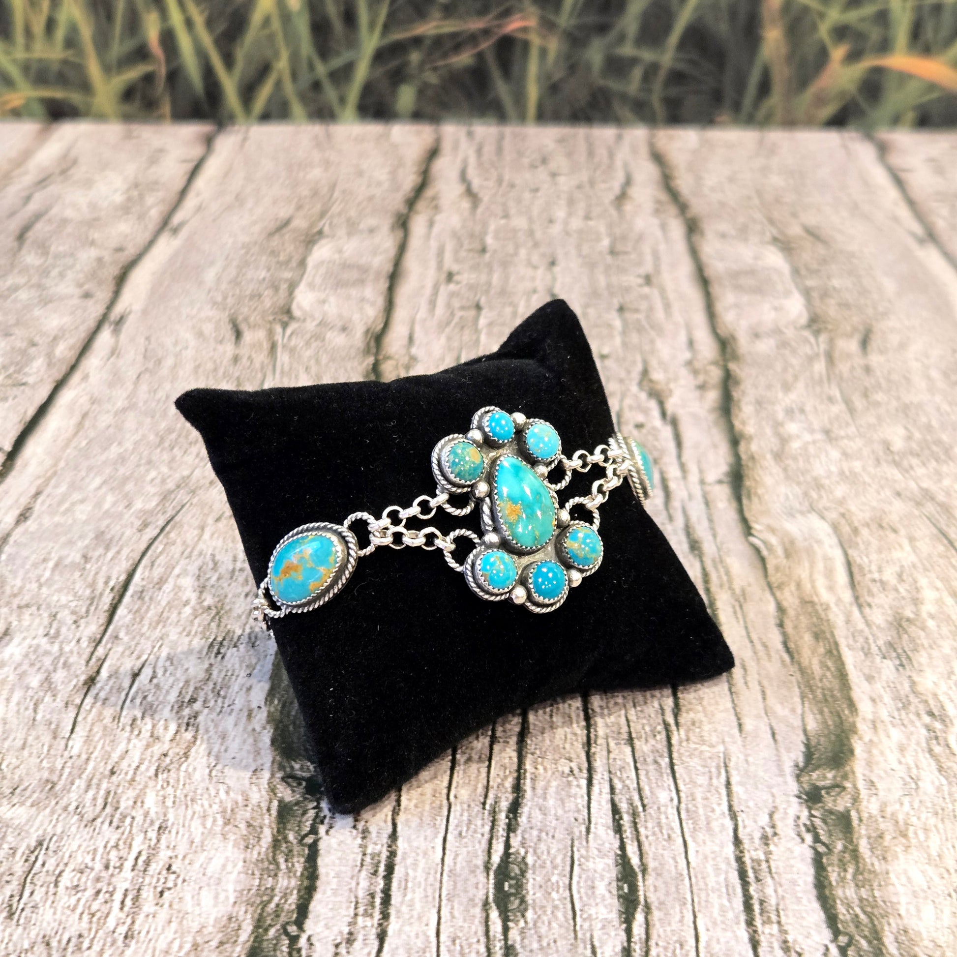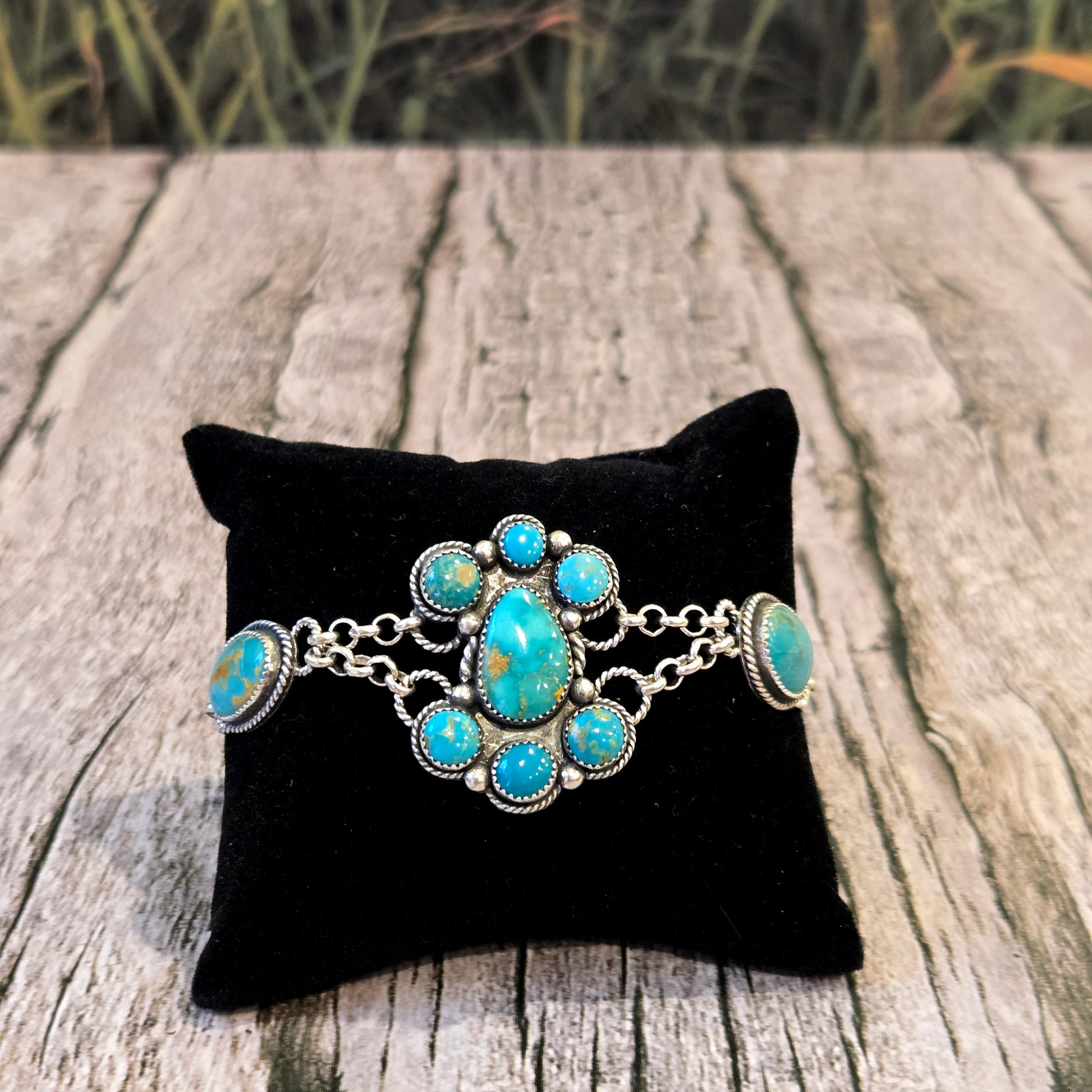 Beautiful handmade bracelet. Center cluster with 4 single stone settings. Large lobster claw clasp in the back. Stunning!