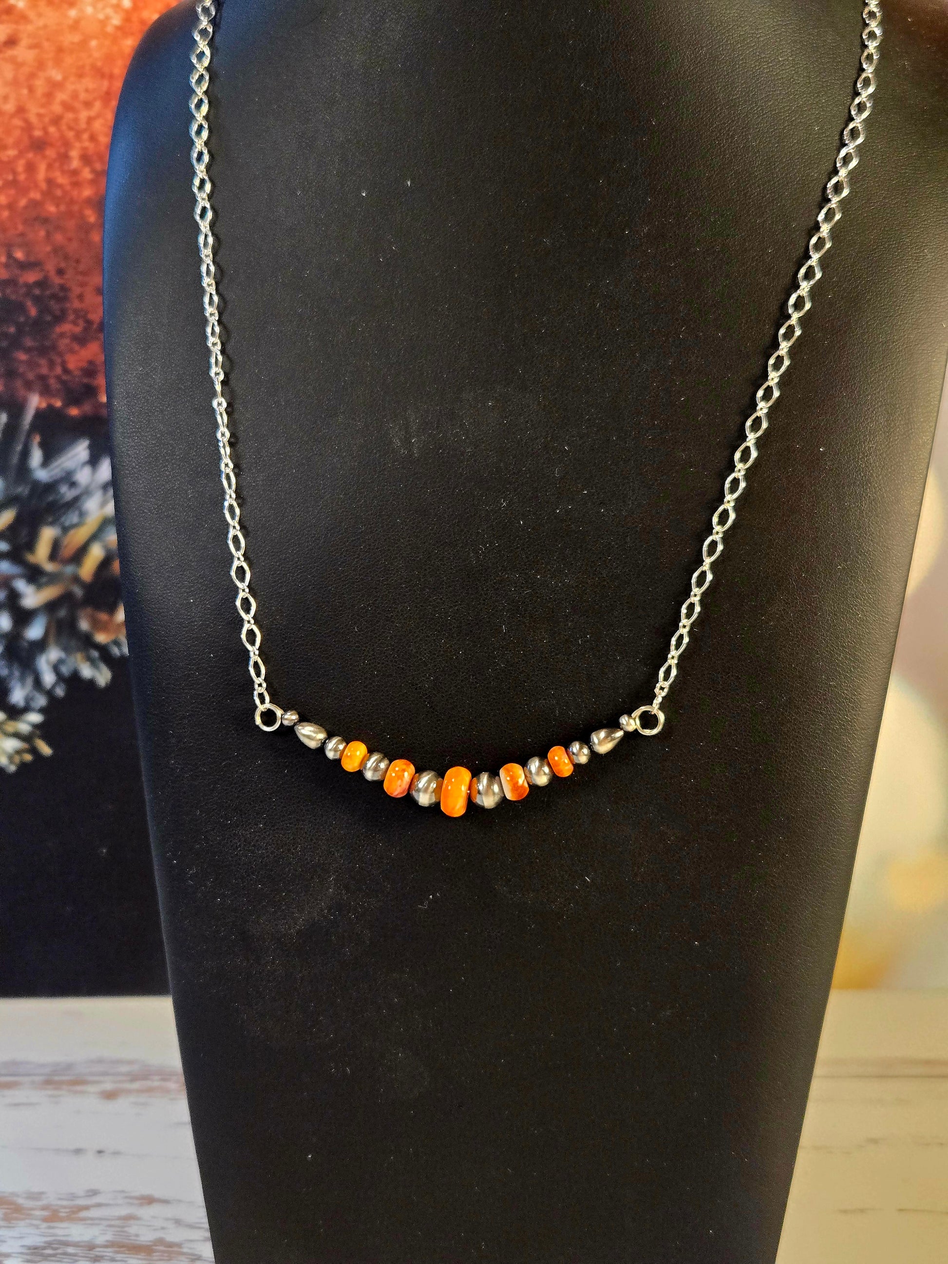 Sterling silver oxybead with orange spiny oyster shell on sterling silver wire and chain.